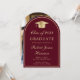 Anúncio de formandos vermelho em forma de arco clássico com burgundy apresentando um boné de formando de ouro, o nome do formando e o ano de classe em uma elegante escrita de ouro, e sua universidade, major e honra. A foto deles preenche a parte de trás do cartão.