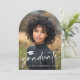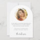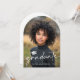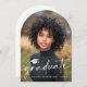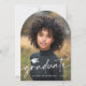 Cartão de anúncio em forma de arco com a forma de fotografia, com a sua fotografia, um boné de formatura e o texto "formando" numa letra moderna e elegante. Adicione uma foto adicional e uma mensagem personalizada no verso.