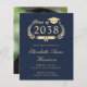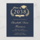 Anúncio formal de formandos azul escuro, favorável ao orçamento, com "Classe de" numa ilustração dourada clara de uma coroa de louros que incorpora um boné superior e um diploma de formando e o nome do formando num elegante guião dourado claro. Adicione sua escola, major, honras ou planos futuros. A foto deles preenche a parte de trás do cartão. Este papel semirbrilhante do orçamento é semelhante em peso ao papel fotográfico. Também está disponível uma versão maior do estoque de cartão tradicional 5x7 (mensagem para o link).