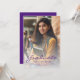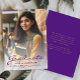 Anúncio de graduação moderno com uma foto vertical personalizada. A palavra "Formando" aparece em roxo, com o nome do formando, a escola e o ano de graduação abaixo em sans serif. Substitua facilmente a imagem de amostra pela foto do seu próprio formando. Uma tela de gradiente branco ajuda a garantir os pop de texto. Adicione detalhes sobre as realizações do seu formando e planos futuros sobre o inverso em texto dourado sobre fundo roxo sólido. Ideal para segundo grau ou formandos.