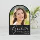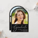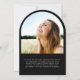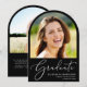 Anúncio de graduação em preto em forma de arco elegante com a foto do formando, "Formando" em uma escrita em branco na moda, e seu nome, ano de aula e escola em uma tipografia branca simples e moderna. Adicione uma foto adicional e seu anúncio personalizado no verso.