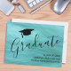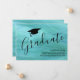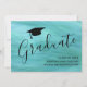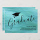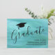 Envie a sua família e amigos este cartão de anúncio de formatura turquesa moderno e elegante. Este design apresenta um impressão de vidro azul e turquesa no fundo com um boné de formatura. Personalize com seu nome, escola e ano.