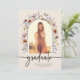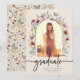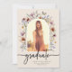 Anúncio de Graduação Floral. Este anúncio de graduação elegante e sofisticado apresenta belas flores silvestres pintadas à mão em aquarela, dispostas como um lindo buquê, e uma caligrafia elegante. A parte de trás inclui um belo padrão coordenado. Encontre produtos correspondentes na Coleção de Graduação Boho Wildflower.