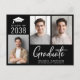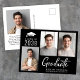 Cartão postal de anúncio de graduação preto moderno com 3 fotos e "Graduado" em uma fonte contemporânea em branco negrito. Adicione o nome do graduado, ano de conclusão e escola ou universidade em tipografia branca simples.