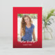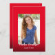 Este modelo de anúncio de graduação minimalista moderno vermelho e branco apresenta uma caligrafia e foto na frente do cartão. Uma foto adicional no verso e texto fácil de alterar para torná-lo seu.