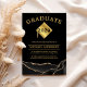Cartão de anúncio de graduação moderno de 2025 com fundo preto e padrão de brilho dourado, um chapéu de formatura com o ano da turma no topo, o nome do aluno e seus planos futuros.