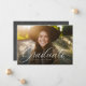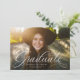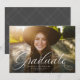 Um anúncio clássico e elegante com script de graduação em branco na parte inferior de uma foto horizontal. O texto personalizado inclui espaço para o nome do graduado, bem como detalhes da escola e do ano. O fundo cinza carvão escuro tem um padrão de grade simples e a cor pode ser alterada clicando em "personalizar ainda mais". Anuncie a conquista do seu graduado para amigos e familiares com este design!