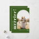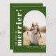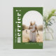 Um cartão de anúncio de gravidez de férias tipográfico divertido com sua foto de gravidez favorita em forma de arco e "quanto mais, melhor!" em fonte branca sobre um fundo verde. Você pode adicionar uma mensagem opcional no verso.