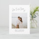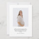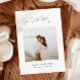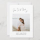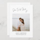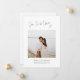 Cartão de anúncio de gravidez na moda e minimalista com texto escrito no topo que diz "em breve três" com coração. Você pode adicionar uma foto na frente e atrás.