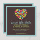 Um coração de corações em turquesa, lima, laranja e rosa quente faz um ótimo design divertido para um anúncio moderno de lembre-se da data.