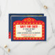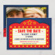 Um anúncio muito divertido para salvar a data que apresenta um letreiro de cinema com os nomes da noiva e do noivo como a estrela de seu próprio filme. No verso do anúncio há uma tela de cinema com pessoas sentadas na plateia em silhueta, adicione suas fotos de noivado à tela para que você possa ser a estrela do seu próprio filme. O nome do filme pode ser alterado para qualquer coisa, pois o cartão é totalmente personalizável.
