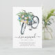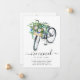 Envie a sua família e amigos este cartão de mudança inspirador para que eles saibam seu novo endereço. Esta design esmaecida apresenta uma bicicleta preta com um cesto de flores azuis e brancas. Em uma tipografia moderna e escrita à mão, lê-se "Nós nos movemos" com seu nome e endereço para você personalizar. A parte traseira do cartão tem uma mensagem e uma assinatura para você personalizar, bem acentuada por um cesto de flores. Projetado apenas para você por Susan Coffey.