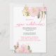 Cartão de Anúncio Móvel Personalizado com design floral cor-de-água rosa. A carta é decorada com bonito flores rosa e douradas. O modelo está pronto para adicionar sua própria mensagem personalizada, seus nomes e seu novo endereço. Novo endereço é escrito à mão em tipografia rosa. Por favor, procure na minha loja a coordenação das etiquetas de endereço.