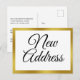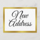 'Novo Endereço' aparece em escrita preta na frente deste anúncio de mudança. No verso, você pode personalizar seu cartão com sua mudança de endereço, nome, novo endereço, e-mail e/ou números de celular. Todo o texto pode ser editado ou excluído.