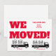 Indique claramente a transição do seu negócio com este anúncio moderno de mudança de escritório. O design apresenta dois caminhões pretos de mudança com ícones detalhados de mesa de escritório e computador, combinados com um título em negrito vermelho "NÓS NOS MUDAMOS!" que é impossível de ignorar. Contra um fundo branco limpo, este modelo oferece um layout estruturado para o nome da sua empresa, novo endereço, número de telefone e site. É uma escolha perfeita para escritórios corporativos, empresas de tecnologia ou serviços profissionais que desejam um design direto e focado na indústria para informar os clientes sobre sua nova localização.