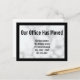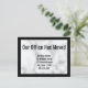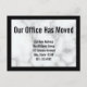 O texto exibido diz 'Nosso escritório mudou'. Personalize seu cartão postal com o nome da sua empresa, novo endereço e número de telefone. O fundo tem uma aparência de mármore branco. O cartão postal tem uma borda preta.