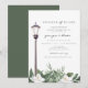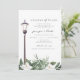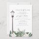 Este anúncio de mudança de planos de casamento apresenta magnólias em aquarela e um poste de iluminação inspirado na Bourbon Street de Nova Orleans. Altere facilmente as fontes, cores das fontes e cor do fundo para combinar com o estilo do seu evento.