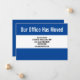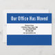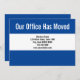 Este cartão azul escuro e branco pode ser editado para criar um anúncio de mudança empresarial personalizado. Como mostrado, o cartão diz Nossa Escritório Mudou no topo. Cinco linhas de texto de exibição adicionais estão disponíveis para o nome da sua empresa, número de telefone e site. Todo o texto pode ser editado ou excluído.