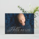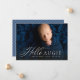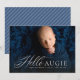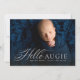 Este anúncio de nascimento com uma foto apresenta uma elegante letra cursiva "olá" ao lado de um nome ou apelido. Também inclui espaço para o nome do bebê e outros detalhes na parte inferior de uma foto horizontal. A cor azul no fundo torna-o perfeito para anunciar um doce bebê menino e para combinar com fotos de recém-nascido. Outras cores também disponíveis.