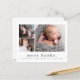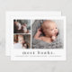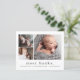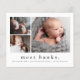 Um doce anúncio de nascimento de colagem de fotos com um nome moderno simples 3 fotos na frente. A parte traseira tem um cabeçalho de nome de cheio grande e uma mensagem pessoal da família. Clique no botão editar para personalizar este design com suas fotos e detalhes.
