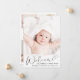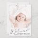 Um cartão moderno para anunciar o nascimento do seu bebê, com a foto dele ou dela sobreposta com "Bem-vindo" escrito em um roteiro de na moda com uma batida cardíaca. Por baixo adicione o seu nome, data de nascimento e estatísticas de nascimento. No verso, adicione três imagens adicionais e uma mensagem personalizada.