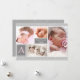 Um anúncio de nascimento encantador para as férias com espaço para quatro fotos e dois blocos para uma inicial e um nome. É aparado em cinzas leves com estrelas brancas em frente e atrás e apresenta um painel para todos os detalhes no verso.