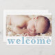 Este anúncio de nascimento de fotos tem um design clássico moderno. A frente do cartão apresenta uma grande foto horizontal com a palavra "bem-vindo" escrita em caracteres tradicionais azuis. Adicione o nome do seu bebê e a data de nascimento para o toque final. No verso do anúncio de nascimento, você pode incluir outra foto, uma mensagem personalizada para os destinatários e seus nomes.