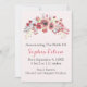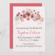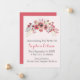 Um anúncio de nascimento de uma menina floral com cor d'água feminina com tipografia elegante. O nome da menina é colocado em cor-de-rosa-rosa que acentua as cores no entalhe floral no topo do design. O resto do texto elegante é preto. A parte traseira está definida em cor rosa para adicionar uma cor de abertura ao design.