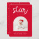 Bem-vindo à estrela mais recente da sua temporada com este adorável cartão de anúncio de nascimento de bebê de Natal com um design vermelho brilhante e um arco de foto alegre. Perfeito para apresentar seu pequeno aos amigos e familiares, este cartão de férias de recém-nascido captura a alegria e o calor do primeiro Natal do seu bebê. Adicione o nome do seu bebê, foto e detalhes de nascimento para um souvenir personalizado. Personalize o seu hoje.