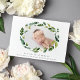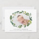 Os anúncios de nascimento botânico elegantes apresentam a sua pequena e doce fotografia (horizontal ou orientada à paisagem) rodeada por uma coroa oval de uma luxuosa folhagem verde e flores brancas. Personalize com o nome do seu bebê e as estatísticas de nascimento.