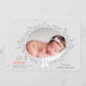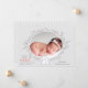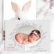 Copyright © 2018 Socialite Design Inc. & LICENCORS - Este belo cartão de nascimento fotográfico tem coelhos de floresta na frente e uma área fotográfica cercada por uma simples coroa. A cor de fundo é uma cinza de pomba macia. As costas têm animais de floresta com fundo de poca-ponto.