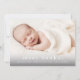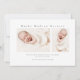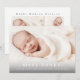 Um anúncio de nascimento com foto doce apresentando um nome moderno no topo de uma foto horizontal de paisagem com sangria. A parte traseira tem dois espaços adicionais para fotos, um cabeçalho com nome completo e uma mensagem pessoal da família.