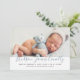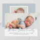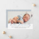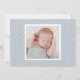 Cartão de anúncio de nascimento de foto simples e moderno com letra manuscrita para o nome do bebê menino e texto limpo para todas as estatísticas importantes de nascimento. Uma foto paisagem na frente e uma foto quadrada no verso destacam o seu novo bebê. Um padrão de bolinhas brancas abstratas em um fundo azul suave e azul-cinza claro enfeita o verso deste cartão de dois lados. Todas as cores de texto e fundo são totalmente personalizáveis.