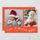 Cartão-modelo de anúncio de nascimento com tema de feriado mínimo e moderno, com 2 fotos do seu recém-nascido na frente, com um texto de tipografia divertido que diz "o menor noel". Você também pode adicionar outra imagem e mensagem no verso. O fundo está vermelho.