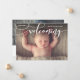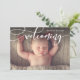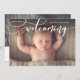 Este anúncio de nascimento de fotos simples e chic apresenta uma escrita imitadora que destaca a sua nova chegada. Adicione uma foto adicional ao verso e aos detalhes. Selecione uma forma recortada, papel texturizado ou um papel ultra grosso para um toque especial extra.