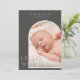Este elegante anúncio vertical de nascimento de fotos apresenta um quadro fotográfico em forma de arco moderno e tons de paleta de cores neutras mais escuros. A frase "Olá, Mundo" compartilha sua alegria junto com detalhes clássicos de tipografia. O verso apresenta uma cor de tom mais leve com espaço para uma foto horizontal e uma mensagem de família.