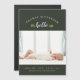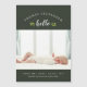 cartões com fotos de anúncio de nascimento de um bebê magnético barato. Este doce design tem um layout de tipografia minimalista com caligrafia "olá" e sotaques botânicos de cor aquática verde sobre fundo verde-escuro. Personalize a design com o nome do bebê, estatísticas de aniversário e nascimento e foto de recém-nascido. Clique em Personalizar para editar as fontes de texto e as cores e adicionar mais fotos para criar ímãs de anúncio de um tipo de nascimento de fotos.