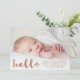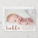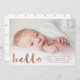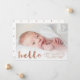 Estes adoráveis anúncios de nascimento de bebês apresentam falsa tipografia rosa dourada que diz "olá", e o nome e a informação do seu bebê em texto correspondente. Adicione facilmente a foto do seu bebê à frente. A parte de trás está coberta por bolinhas na moda faux rosa douradas.