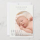 Este elegante anúncio vertical de nascimento de fotos apresenta um quadro fotográfico em forma de arco moderno e tons de paleta azul neutro e suave. A frase "Olá, Mundo" compartilha sua alegria junto com detalhes clássicos de tipografia. O verso apresenta uma cor de tom azul pastel suave com espaço para uma foto horizontal e uma mensagem de família.