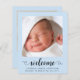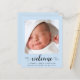 Um simples anúncio de nascimento de um bebê azul pastel, amigo do orçamento. A frente apresenta sua foto, nome, data de chegada e estatísticas de natalidade, e "bem-vindo" em um roteiro de na moda com batidas cardíacas. No verso, adicione outra foto, nomes de pais e irmãos e um obrigado personalizado que você ou outra mensagem.