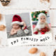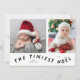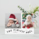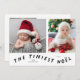 Cartão-modelo de anúncio de nascimento com tema de feriado mínimo e moderno, com 2 fotos do seu recém-nascido na frente, com um texto de tipografia divertido que diz "o menor noel". Você também pode adicionar outra imagem e mensagem no verso. O fundo é branco.