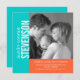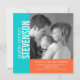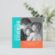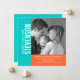 Modelo com foto do anúncio de nascimento do bebê moderno e azul-aqua e laranja com foto. Totalmente personalizável. Use os prompts para substituir a foto da amostra por sua própria fotografia do bebê e detalhes do anúncio de nascimento e o nome do seu bebê. Selecione "personalizar" para alterar as cores do texto e do fundo da frente e da parte traseira da placa. Design por Elke Clarke ©. Esta design ousada e simples é perfeita para os pais que gostariam de um olhar moderno limpo para os seus anúncios de nascimento.