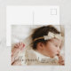 Anúncio de nascimento moderno com foto de bebê. Uma foto adorável do seu recém-nascido com "olá" e o nome do bebê e estatísticas de nascimento.