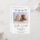 Cartão de anúncio de nascimento moderno com uma única foto na frente e texto nas costas, apresentando uma bandeira azul, título em caligrafia moderna e texto preto. Este cartão de anúncio de nascimento é uma maneira doce de anunciar o nascimento do seu bebê menino.