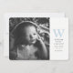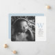Uma simples introdução para o seu novo pequeno com uma única foto, uma grande inicial azul bebê, espaço para estatísticas e nomes dos pais, juntamente com um suporte azul coordenado pontilhado. As cores do texto e do suporte podem ser alteradas clicando no botão "personalizar".