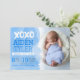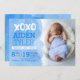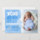 Doce anúncio de bebê. XOXO, com cor d'água em azul-bebê. Abraços e beijos.