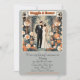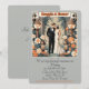 Imagem vintage de um casal de noivos dos anos 20 em pé num jardim rodeado de flores e candeeiros da época. Eles têm uma porta clássica como fundo. Toda a cena evoca uma atmosfera calma. Texto e elementos personalizáveis.