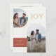 Esses cartões de felicitações planos de 5" x 7" apresentam espaços reservados para três fotos, dois nomes, ano e uma mensagem. A frente tem duas fotos em arco, uma vertical e outra horizontal. A saudação é "Joy," em letras douradas. O fundo é marfim com uma caixa vermelha de tijolo adobe cercando os nomes do casal. A parte de trás tem uma foto vertical. A mensagem personalizável diz: "Estamos emocionados em anunciar que ficamos noivos, e ambos desejamos a você paz e alegria durante as festas de fim de ano e no ano que vem."