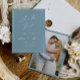 Um cartão minimal para salvar a data do casamento com uma caligrafia simples e moderna em um tom azul poeirento, a maneira perfeita de anunciar seu casamento.