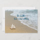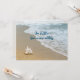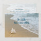 Cartões de anúncio de novo endereço com tema de praia. Personalize o texto sobre cenas de praia em ambos os lados. Uma grande concha sozinha sentada na areia na beira do oceano. O texto é azul escuro.